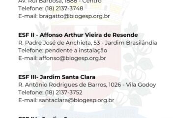 ESF I – Dr. Antônio Júlio Bragatto Av. Rui Barbosa, 1888 – Centro Telefone:(18) 2137-3748 E-mail: bragatto@biogesp.org.br ESF II – Affonso Arthur Vieira de Resende R. Padre José de Anchieta, 53 – Jardim Brasilândia Telefone: pendente a instalação E-mail: affonso@biogesp.org.br ESF III- Jardim Santa Clara R. Antônio Rodrigues de Barros, Leia mais