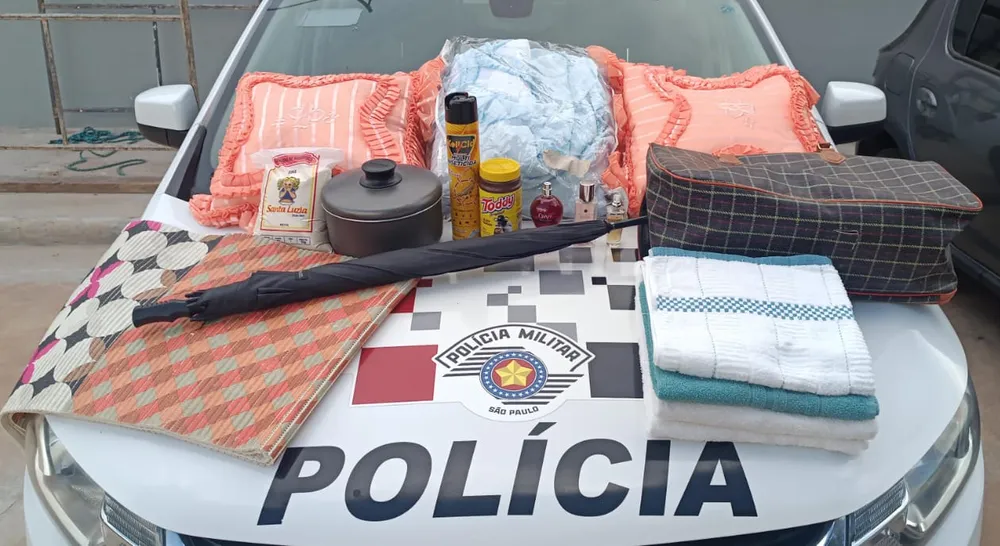 Os policiais recuperaram uma colcha, duas almofadas, um guarda-chuva, quatro toalhas de banho, uma mala de mão, três frascos de perfume, dois braceletes, um pote de achocolatado, um pacote de farinha de mandioca, um frasco de veneno e uma panela de alumínio.