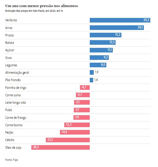 Em média os alimentos subiram 1,95% de janeiro a dezembro de 2023 para os consumidores paulistanos abaixo de 15% de 2022.