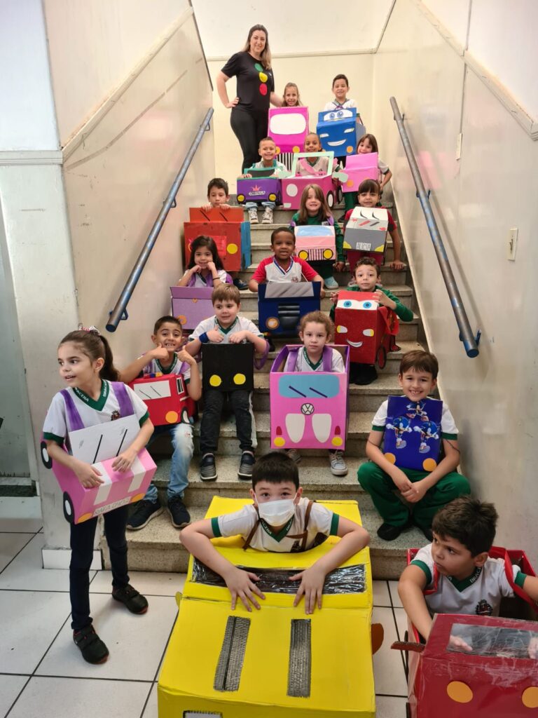 O grupo de crianças saiu caminhando da escola até a Prefeitura, acompanhados de professoras e demais integrantes da equipe escolar, vestidos de ‘carros de papelão’, feitos por eles próprios com explicações das professoras e apoio das famílias e aproveitaram para colocar em prática todo aprendizado sobre as regras do trânsito.