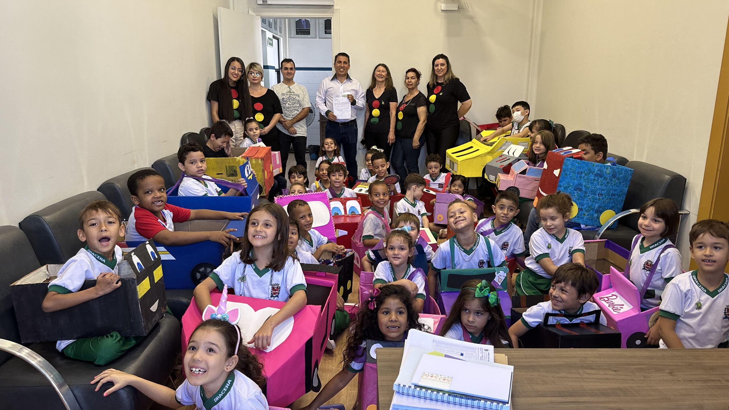 O grupo de crianças saiu caminhando da escola até a Prefeitura, acompanhados de professoras e demais integrantes da equipe escolar, vestidos de ‘carros de papelão’, feitos por eles próprios com explicações das professoras e apoio das famílias e aproveitaram para colocar em prática todo aprendizado sobre as regras do trânsito.