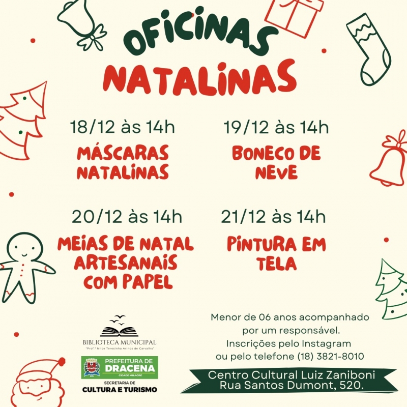 A Secretaria de Cultura e Turismo de Dracena, por meio da Biblioteca Municipal, promoverá oficinas natalinas nos dias 18, 19, 20 e 21 de dezembro.