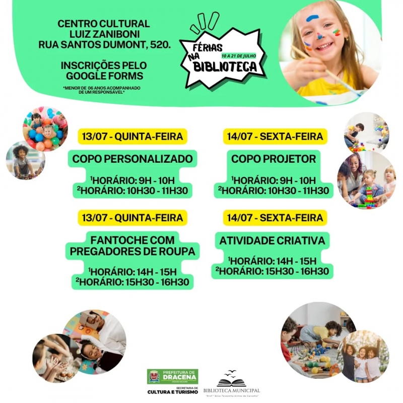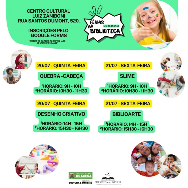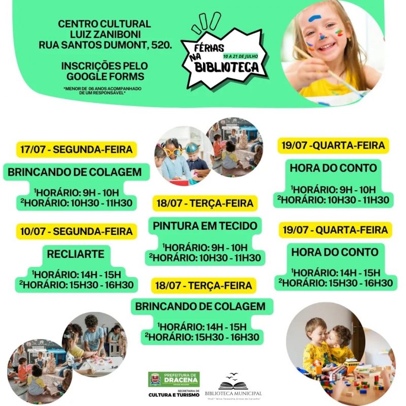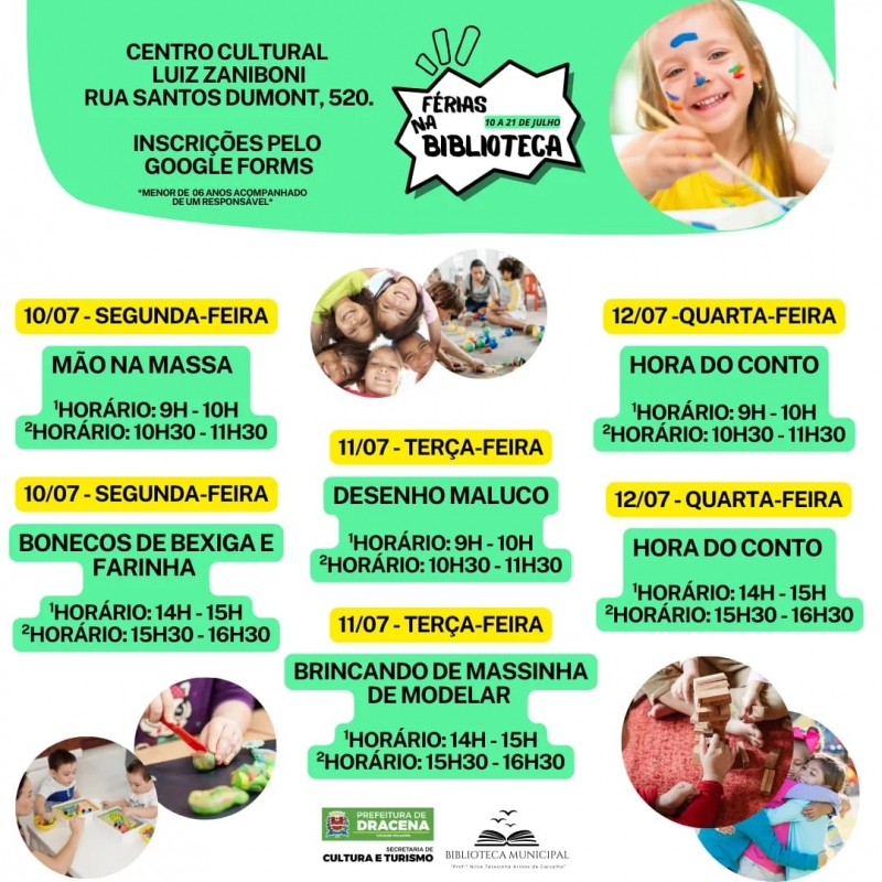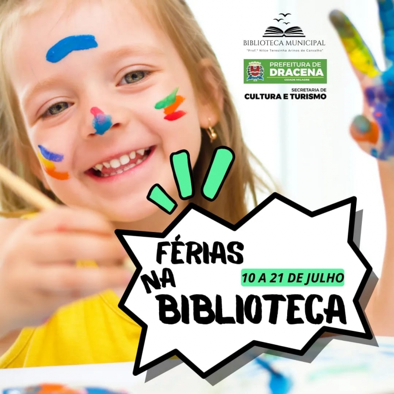 A Secretaria de Cultura e Turismos de Dracena, por meio da Biblioteca Municipal, irá oferecer uma programação especial de atividades para a garotada durante as férias escolares. As ‘Férias na Biblioteca’ acontecerá do dia 10 ao dia 21 de julho com entrada franca e será aberta para todos os interessados.