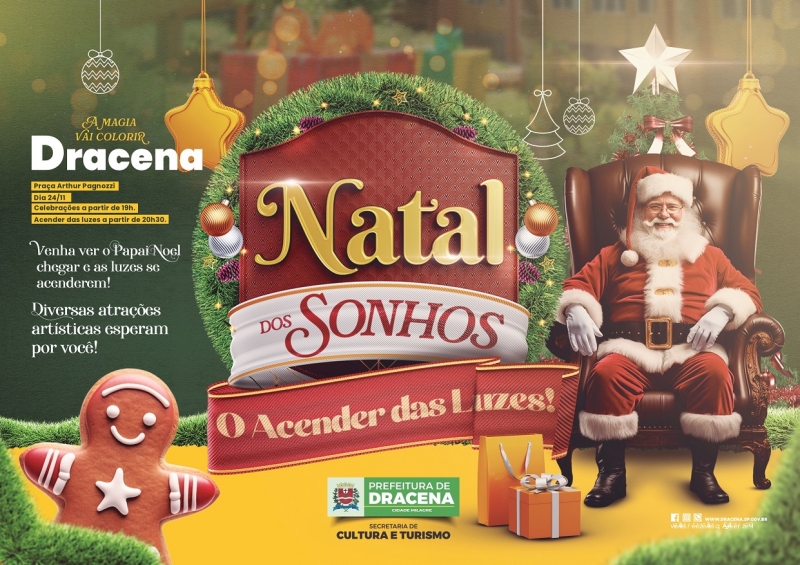 A Prefeitura de Dracena, por meio da Secretaria de Cultura e Turismo, preparou um evento especial para a abertura do Natal dos Sonhos 2023, com o Acender das Luzes e a chegada do Papai Noel. A festa acontecerá nesta sexta-feira, 24, a partir das 19h, na Praça Arthur Pagnozzi. Serão