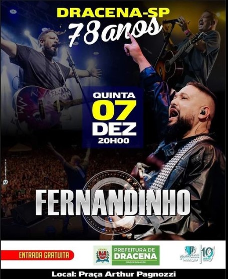 Dia 07 de Dezembro, um dos maiores nomes da música Gospel estará nas comemorações dos 78 anos de Dracena! @fernandinhoepaula Local: Avenida, José Bonifácio , em frente ao Paço Municipal.