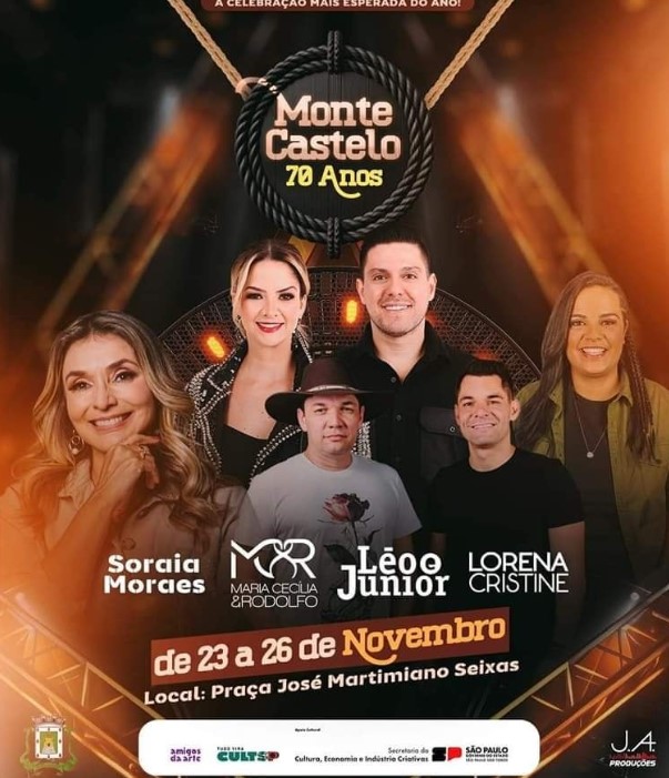 De 23 a 26 de novembro, venha celebrar conosco com apresentações incríveis: Soraya Moraes, Maria Cecília e Rodolfo, Léo e Junior, e Lorena Cristine. Preparem-se para quatro dias repletos de música, alegria à cidade querida. Monte Castelo, ao longo de sete décadas, construindo histórias, criando memórias. Junte-se a nós nesta