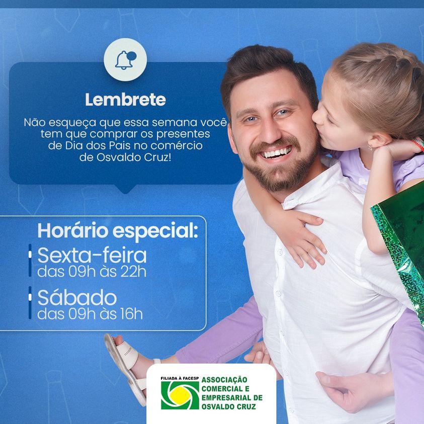 nesta semana do Dia dos Pais, o Comércio de Osvaldo Cruz atenderá em horário especial.
