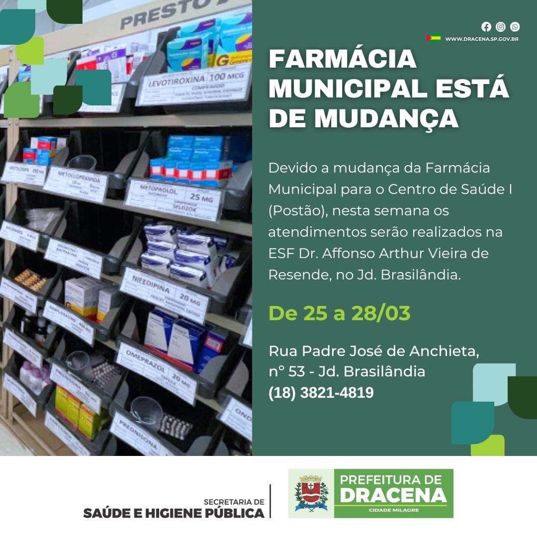 Devido a mudança da Farmácia Municipal para o Centro de Saúde I (Postão), nesta semana os atendimentos serão realizados na farmácia da ESF Dr. Affonso Arthur Vieira de Resende, no Jd. Brasilândia.