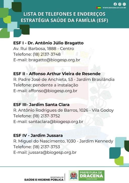 CONFIRA OS TELEFONES E ENDEREÇOS DAS UNIDADES DE ESTRATÉGIA SAÚDE DA FAMÍLIA EM DRACENA