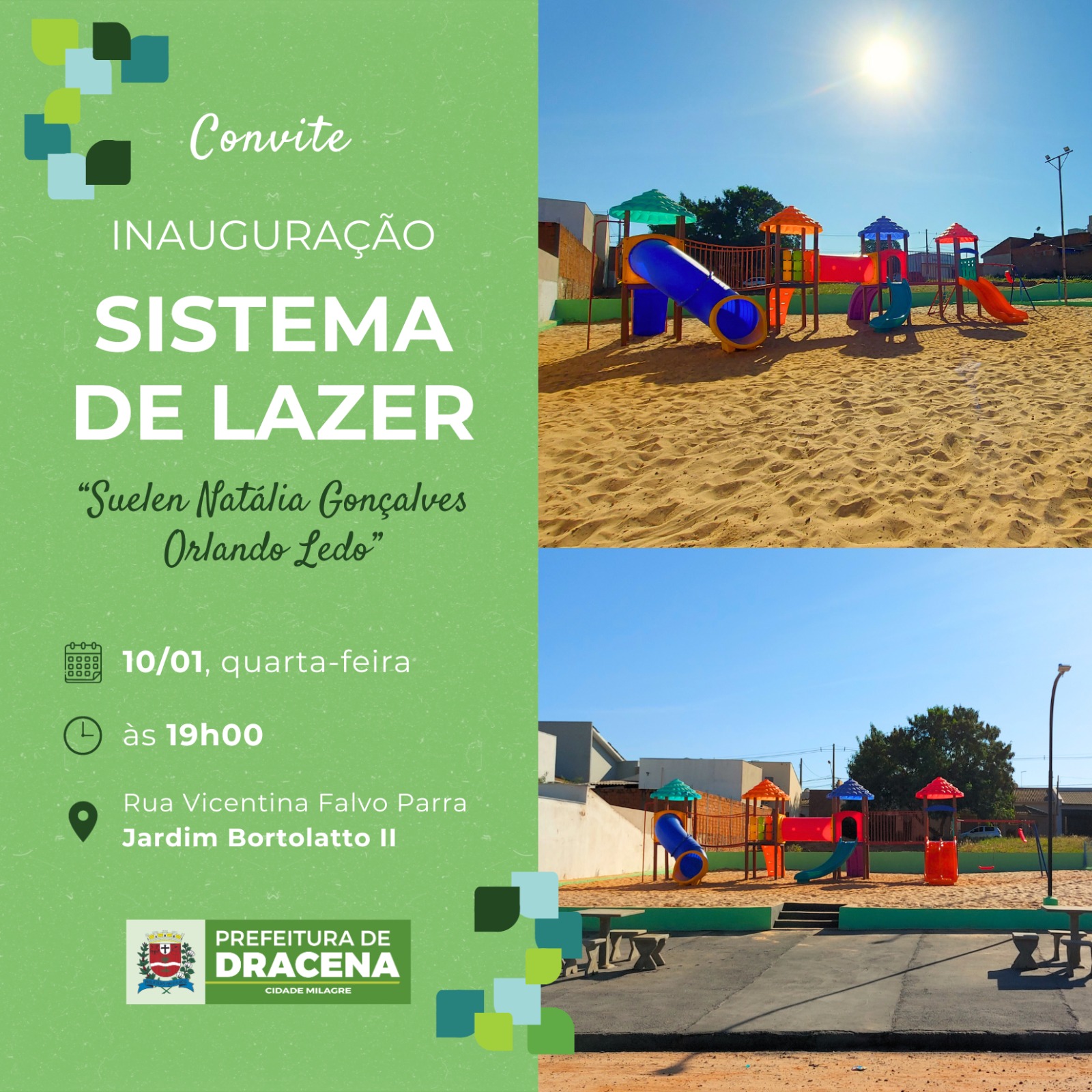 Convidamos a todos para participar da inauguração do parquinho infantil do Jardim Bortolato 2 , que será hoje 10/01 às 19h,