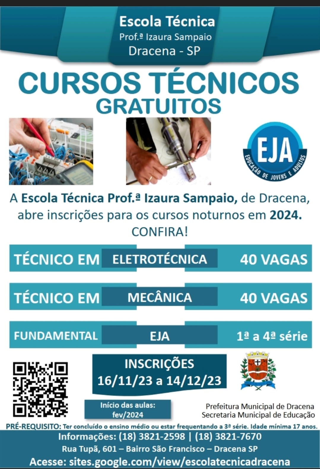 A Escola Técnica Prof.ª Izaura Sampaio, de Dracena, está com inscrições abertas para os cursos noturnos em 2024.Os interessados deverão realizar suas inscrições até 14/12/2023.