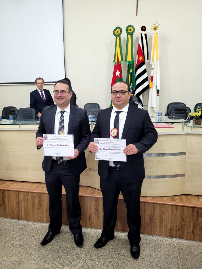 Os Projetos de Decreto Legislativo, apresentados pelo vereador Presidente Danilo Ledo e aprovados por unanimidade pelos Nobres Vereadores, foram o veículo para essa justa homenagem. A Sessão de entrega foi marcada pela emoção, com a presença de Autoridades Judiciárias, Delegados de Polícia, o Diretor do Deinter 8, Dr. Walmir Geralde, Policiais Civis de todas as carreiras, familiares, amigos, convidados e visitantes que lotaram o recinto da edilidade dracenense.