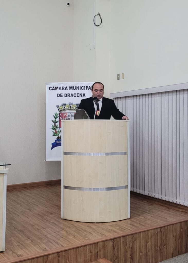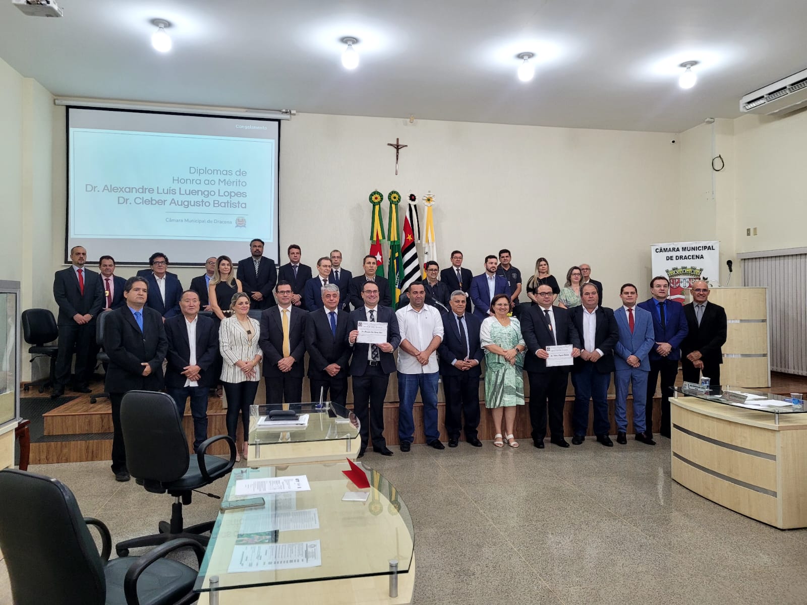 A noite de 13 de maio marcou um evento notável na Câmara Municipal de Dracena: a Sessão Solene de entrega de Diplomas de Honra ao Mérito aos ilustres Delegados de Polícia Dr. Alexandre Luis Luengo Lopes, Delegado Seccional de Polícia de Dracena, e Dr. Cléber Augusto Batista, Delegado de Polícia da DIG.