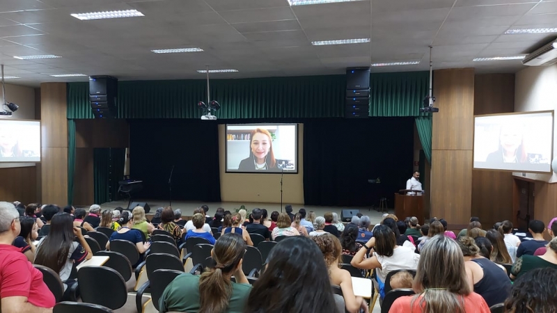 A primeira palestra foi conduzida pela psicóloga Iramaia Ranai Gallerani, especialista em Psicologia Clínica, pós-graduada em Impactos da Violência na Saúde e Mestra em Saúde Mental e Atenção Psicossocial. A palestra, que aconteceu por meio de vídeo chamada, abordou sobre a atenção à mulher vítima de violência doméstica, destacando as formas de escuta, os estereótipos da mulher na sociedade, os impactos na saúde física e mental da violência contra a mulher e como reconhecer os tipos de violência.