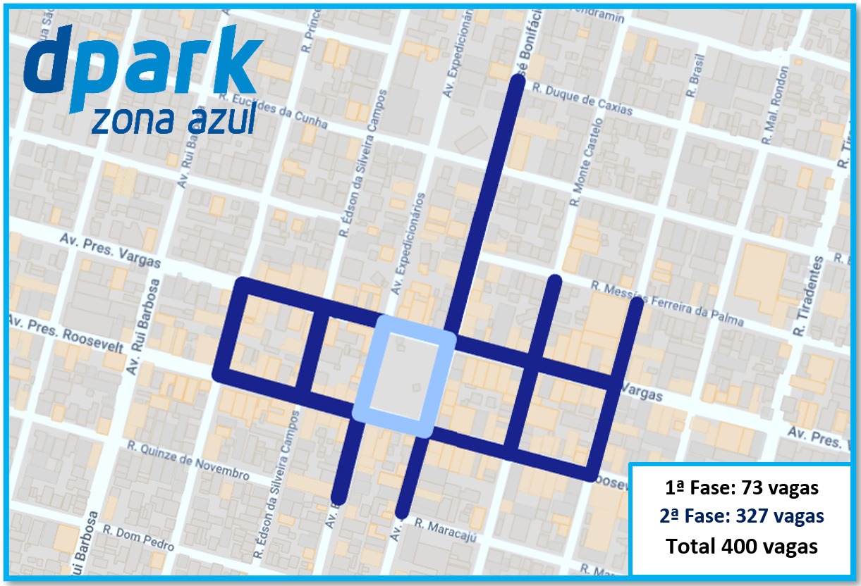 Na próxima segunda-feira (09), a Dpark inicia a segunda fase de implantação das vagas rotativas no município, totalizando 400 vagas. Agora as vagas irão se estender pelas Avenidas Presidente Vargas e Presidente Roosevelt entre a Rua Brasil e a Rua Princesa Isabel, incluindo as ruas adjacentes. Confira o mapa abaixo: