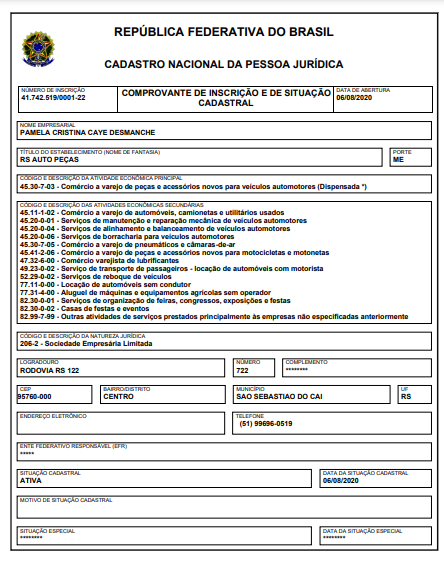 Nome Fantasia no CNPJ: RS Auto Peças.