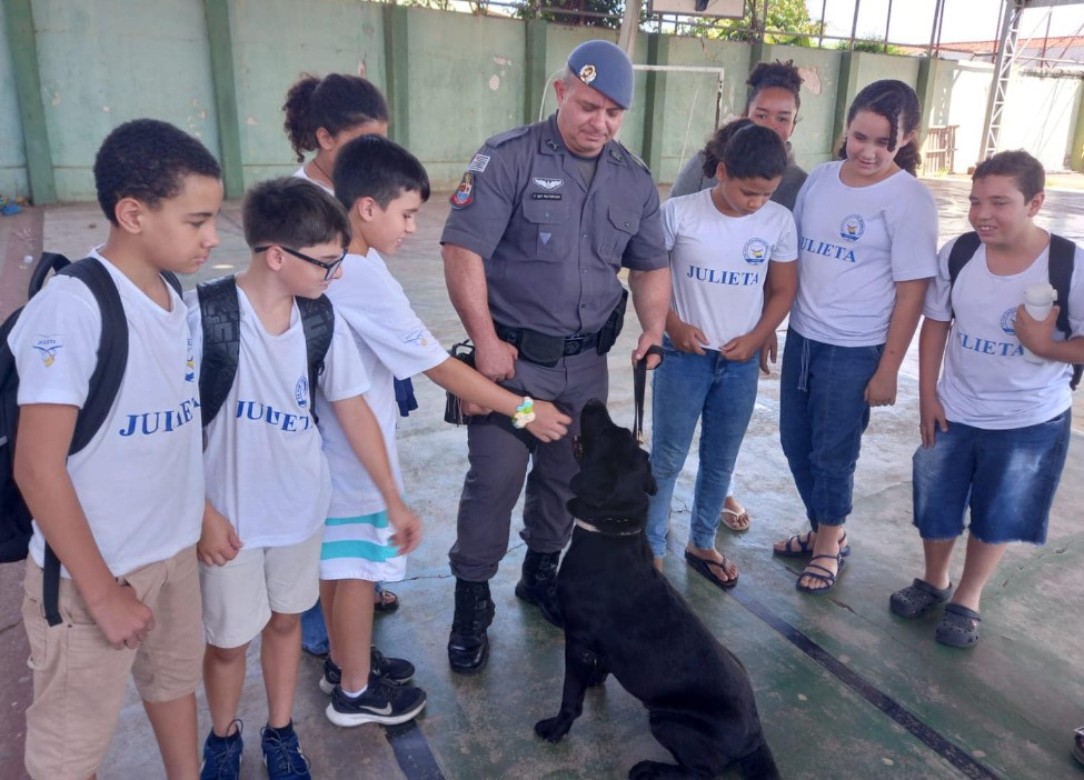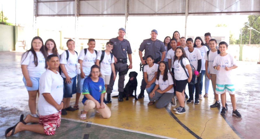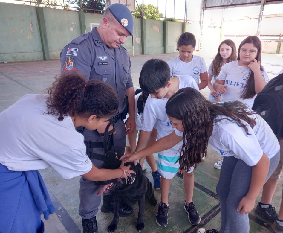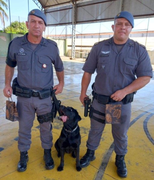 A cadela labradora Emy de oito anos, treinada para desenvolver o trabalho de faro, na busca por entorpecentes ( drogas como: maconha, crack e cocaína), fez demonstrações práticas das atividades que realiza, correu pela quadra da escola, brincou e recebeu carinho de todos. Dando um show de simpatia e doçura, na interação com os adolescentes que ficaram muito felizes em conhecê-la.
