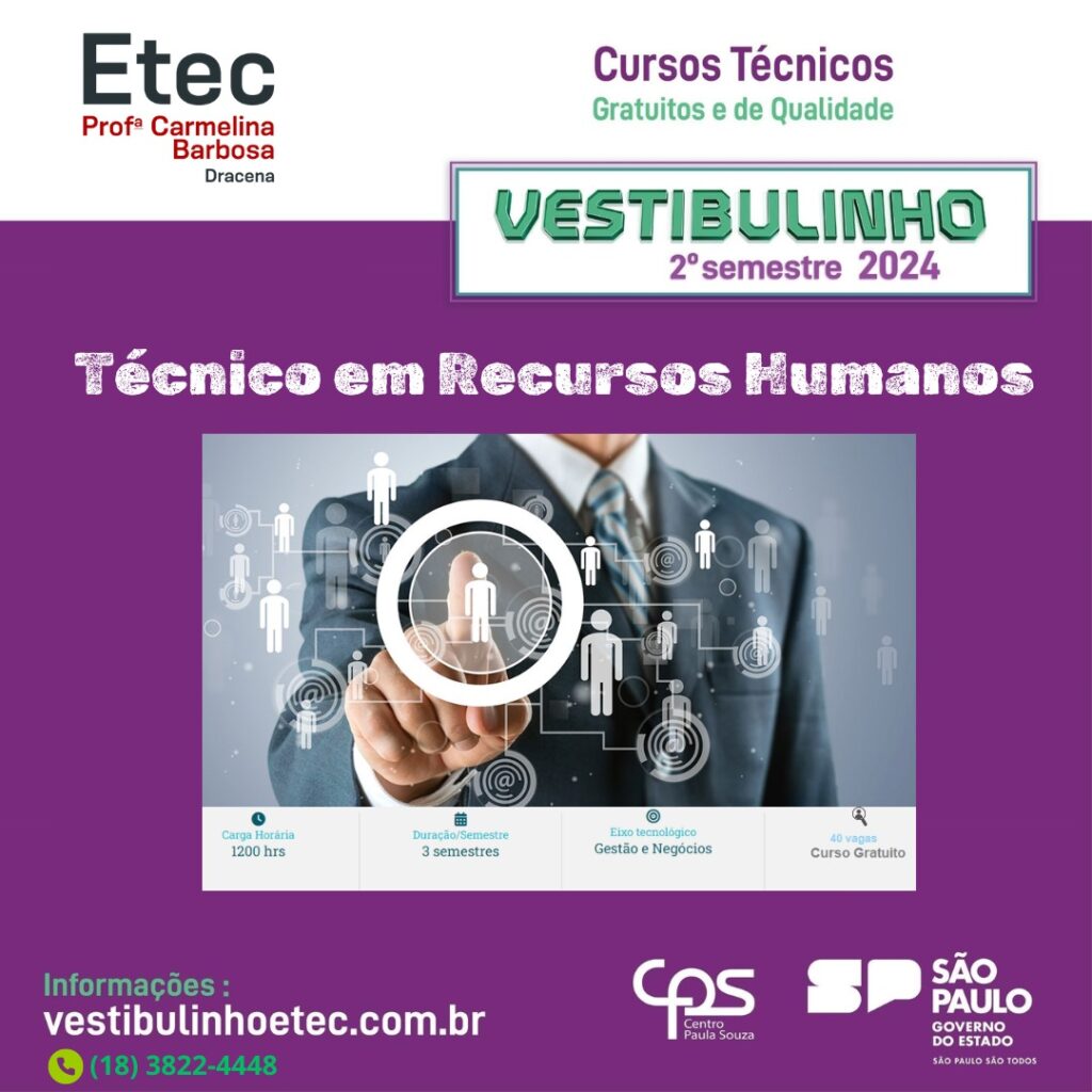 A Etec Dracena está com inscrições abertas para o Vestibulinho do 2° Semestre de 2024. Com uma novidade: Curso técnico em Recursos Humanos. Neste curso, você aprenderá a administrar processos que integram a gestão de pessoas de uma empresa, contribuindo para melhorar as condições de trabalho e as relações humanas nas equipes.