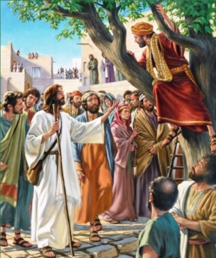 Naquele tempo, Jesus tinha entrado em Jericó e estava passando pela cidade. Havia ali um homem chamado Zaqueu, que era chefe dos publicanos e muito rico. Ele procurava ver quem era Jesus, mas não conseguia, por causa da multidão, pois era baixinho. Então ele correu à frente e subiu numa árvore para ver Jesus, que devia passar por ali. Quando Jesus chegou ao lugar, olhou para cima e disse: «Zaqueu, desce depressa! Hoje eu devo ficar na tua casa. Ele desceu depressa, e o recebeu com alegria.