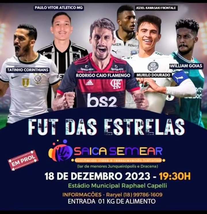 No dia 18 de Dezembro as 19:30h o Estádio Municipal Rafael Capelli tem a honra de apresentar o “FUT DAS ESTRELAS”, com a participação de diversos jogadores de vários clubes, o jogo será em prol a Saica Semear ,com a entrada de 1 kg de alimento.