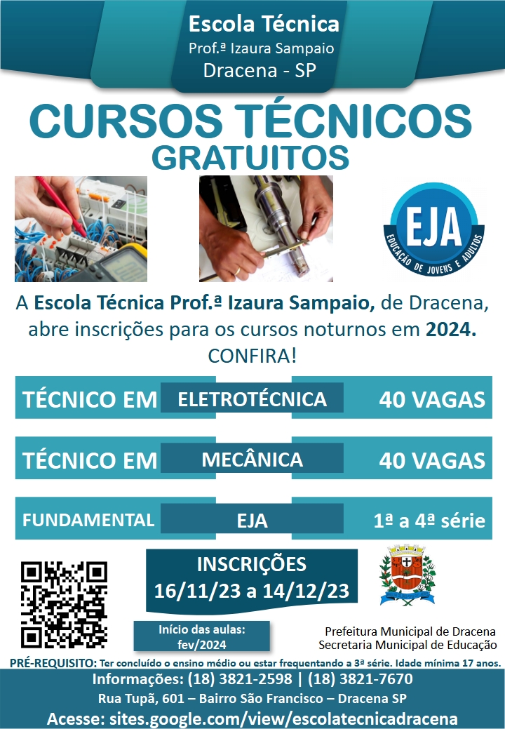 A Escola Técnica de Ensino Prof.ª Izaura Sampaio, no bairro São Francisco, está com inscrições abertas para os cursos técnicos de Mecânica e Eletrotécnica, para alunos de Dracena e região.