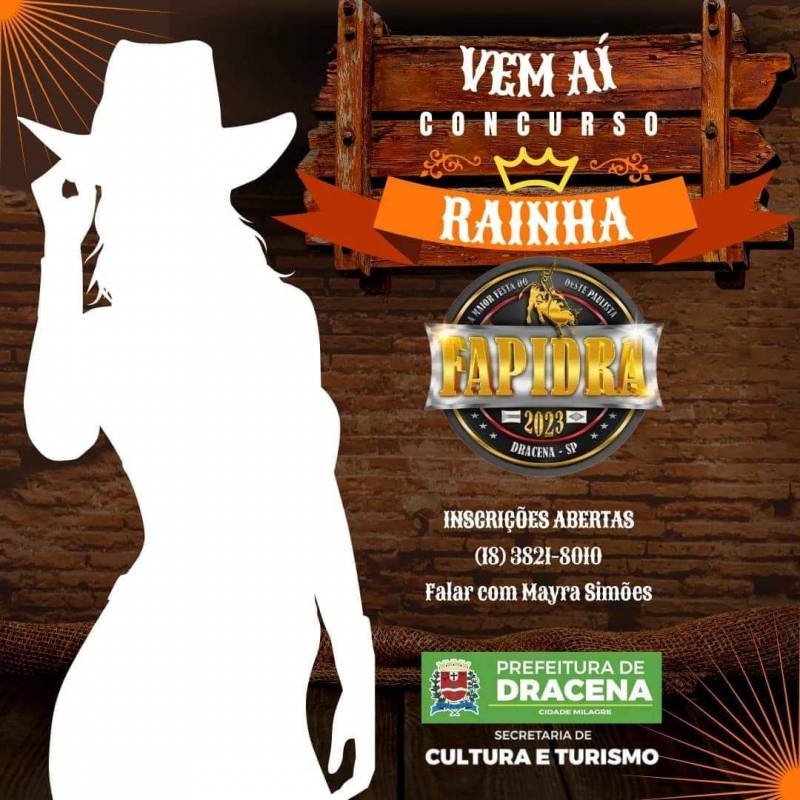 A Secretaria de Cultura e Turismo receberá até amanhã, 21/06, inscrições para o concurso Rainha da Fapidra 2023. Interessadas podem entrar em contato com a diretora de Cultura, Mayra Simões, através do telefone 3821-8010.