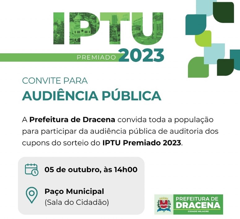 Prefeitura de Dracena convida toda a população para participar da audiência pública para auditoria dos cupons do sorteio do IPTU Premiado 2023 nessa quinta-feira (05).
