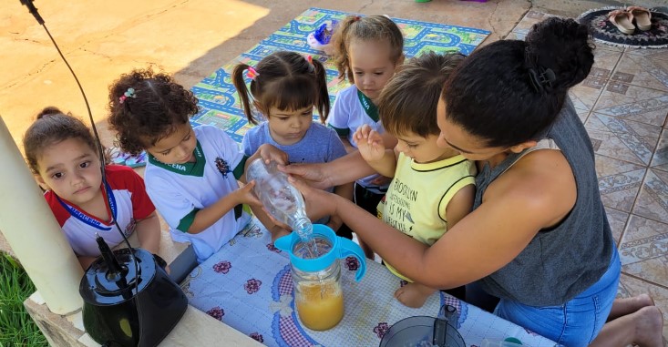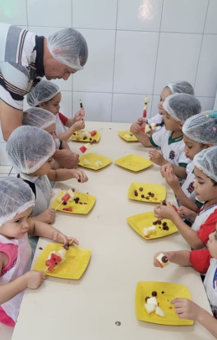 Na última semana, os alunos do maternal A da EMEI Criança Feliz, do distrito de Jaciporã, desenvolveram, se maneira lúdica, uma receita saudável com alimentos que contém muita água. A atividade faz parte de um projeto do Programa “A União Faz a Vida” e favoreceu aprendizagens significativas e aumento de vínculos entre as crianças e seus familiares.