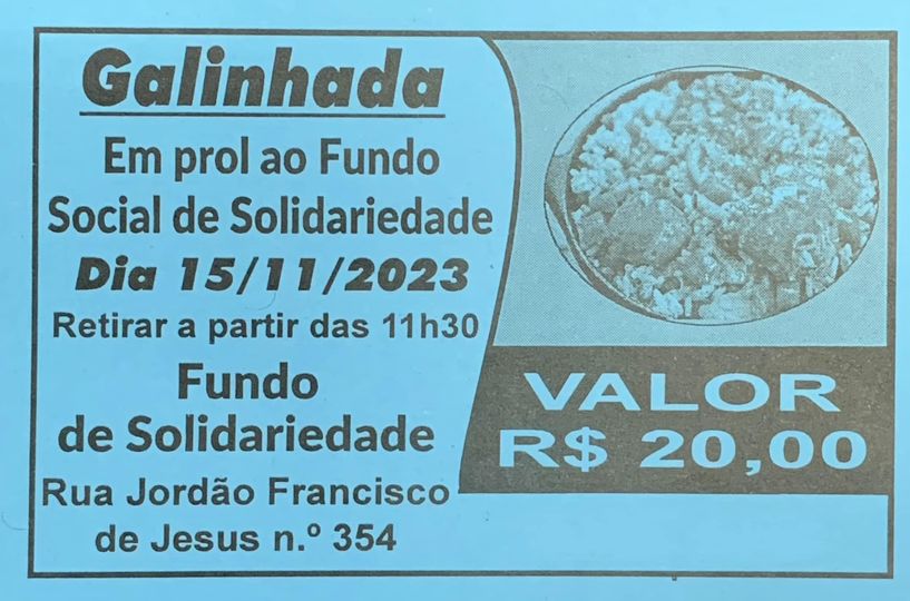 Pode ser uma imagem de texto que diz "Galinhada Em prol ao Fundo Social de Solidariedade Dia 15/11 15/11/2023 Retirar a partir das 11h30 Fundo de Solidariedade Rua Jordão Francisco de Jesus n.° n. 354 VALOR R$ 20,00"