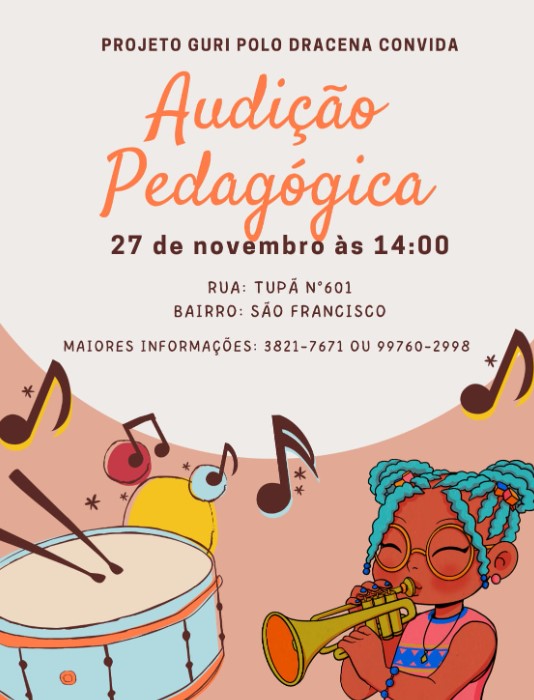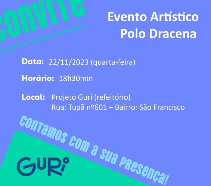 O Polo do Projeto Guri promove nesta semana os últimos eventos deste semestre de 2023. Amanhã, 22/11, às 18h30, ocorre evento artístico, com a participação das turmas avançadas, na sede do Projeto Guri, localizado na Rua Tupã, 601, no Bairro São Francisco.