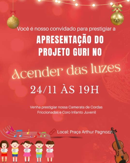 Na sexta-feira, 24, às 19h, fará participação na abertura do ‘Acender das Luzes’, com o Canto Coral e a Camerata de Cordas Friccionadas, na Praça Arthur Pagnozzi.