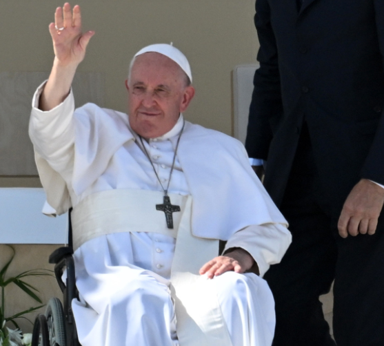 Com dificuldades para caminhar, o papa de 86 anos usou uma cadeira de rodas nos momentos em que precisou se locomover pelo palco.