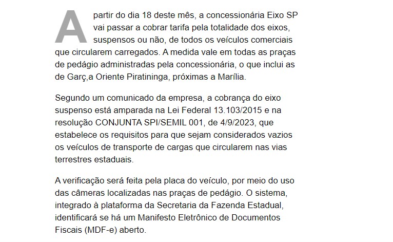 A MEDIDA VALE EM TODAS AS PRAÇAS ADMINISTRADAS PELA CONCESSIONÁRIA, O QUE INCLUI AS DE GARÇA ORIENTE , PIRATININGA ,PRÓXIMA A MARÍLIA