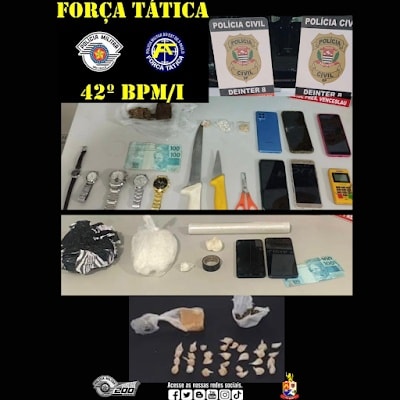 O primeiro foi cumprido na Rua São Luiz, Jardim Real, sendo o indiciado encontrado em sua residência, e durante a busca domiciliar foi localizada no quarto uma embalagem com cocaína “in natura” e dentro de um tênis, dois invólucros, um contendo dez porções prontas para venda e no outro, uma porção in natura, ambas de cocaína.