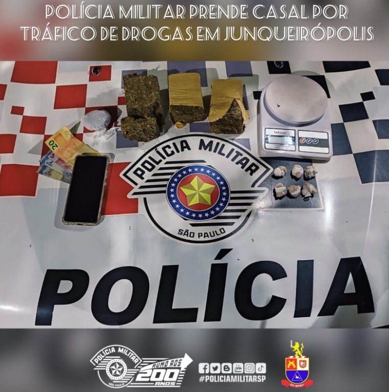 A equipe recebeu informações de um veículo que estaria saindo de Dracena sentido Junqueirópolis e no interior havia um casal em atitude suspeita, realizada a abordagem, e o casal submetido busca pessoal, foi localizado no interior de uma bolsa 04 tablet de maconha e 06 porções de crack, indagados informaram que adquiriram a droga na cidade de Dracena e que iriam fracionar para comercializar no município de Junqueirópolis, e informaram que havia mais drogas em sua residência, a equipe deslocou até a residência do casal e localizou mais uma porção de maconha e uma balança de precisão. Diante dos fatos, foi dada voz de prisão em flagrante pelo crime de tráfico de drogas e conduzidos ao Plantão Polícia Judiciária, permanecendo o casal preso à disposição da Justiça.