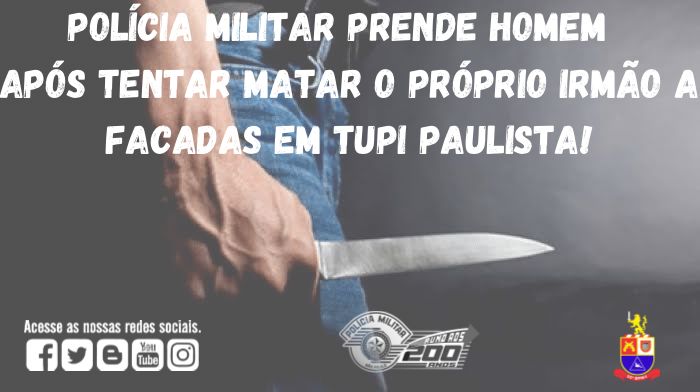 Na data de hoje (12) por volta das 12h14min a equipe da Polícia Militar de serviço pelo município de Tupi Paulista, foi acionada para atendimento de ocorrência vítima por arma branca(faca) onde dois irmãos haviam se desentendido e um teria sido agredido a facadas. No local defronte à uma residência havia um indivíduo (homem 47 anos) caído sobre a calçada com corte profundo no pulso do braço direito e no abdômen uma pequena perfuração,