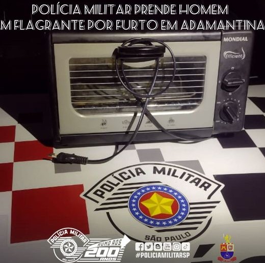 Na última sexta-feira (22) por volta das 23h50min a equipe da Polícia em serviço pelo município de Adamantina, foi acionada para atendimento de ocorrência de furto à residência, pelo local foram repassadas características físicas e vestimentas do autor, que carregava um saco plástico de cor preto nas costas, e a direção tomada por ele, iniciado o patrulhamento com vista, localizando um indivíduo com as mesmas características, submetido a abordagem e localizado durante a revista pessoal dentro do saco plástico que trazia consigo, um forno elétrico da marca mundial, indagado sobre a procedência do objeto encontrado em sua posse, o suspeito disse que subtraiu da residência de sua mãe através após arrobar a janela lateral, e que levaria para trocar por drogas. informou ainda que seus pais estão viajando, e já subtraiu outros objetos como 02 botijões de gás, 02 air frair, 01 geladeira os quais vendeu em troca de droga. Diante dos fatos, foi dada voz de prisão ao autor e encaminhado ao Plantão de Polícia Judiciária, devido as vítimas estarem viajando, o autor foi ouvido e liberado.