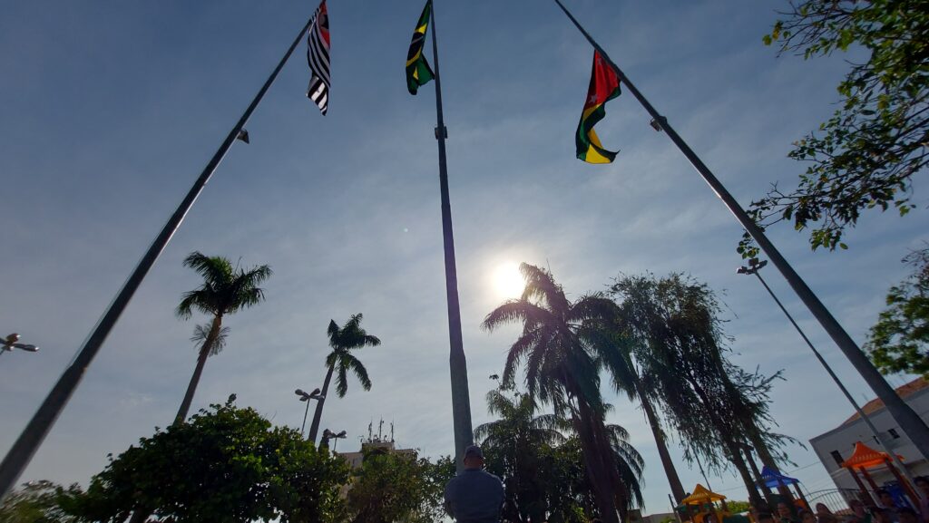 Na tarde desta quarta-feira (6), a Prefeitura de Dracena, com o apoio do Corpo de Bombeiros, realizou o hasteamento de novas bandeiras na Praça Arthur Pagnozzi. As bandeiras do Brasil, do Estado de São Paulo e do Município de Dracena foram trocadas para a celebração do Dia da Independência do Brasil, que será comemorado amanhã (7) com ato cívico no Ginásio de Esportes ‘Alaor Ferrari’.