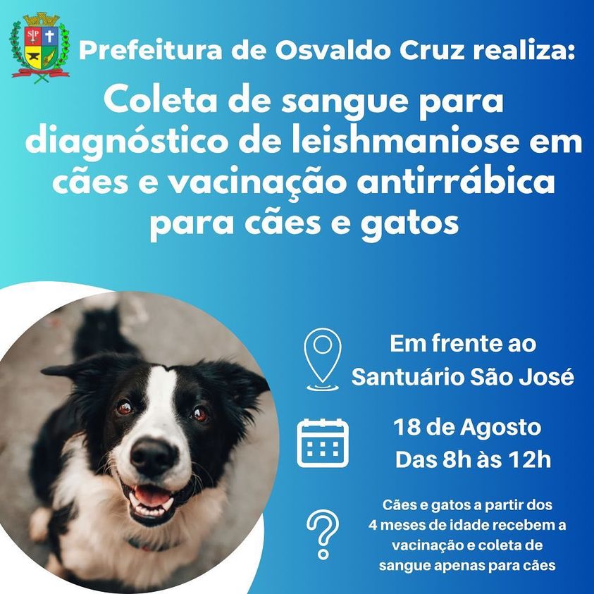 APrefeitura de Osvaldo Cruz realiza no próximo dia 18 (sexta-feira) uma nova etapa da Campanha de Vacinação Antirrábica Animal, das 8h às 12 horas, na praça da Matriz, em frente ao Santuário São José.
