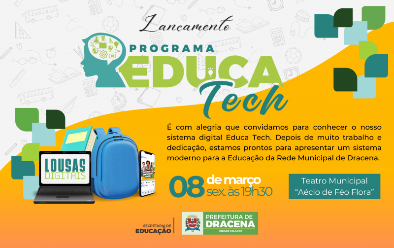 A Secretaria de Educação lançará, na noite dessa sexta-feira, 8, o Programa Municipal de Inovação Tecnológica na Educação Fundamental, denominado EducaTech. O programa tem o objetivo de implantar e desenvolver ações de inovação tecnológica nas escolas da rede municipal de ensino de Dracena. O evento acontecerá às 19h30 no Teatro Municipal “Maestro Aécio de Féo Flora”.