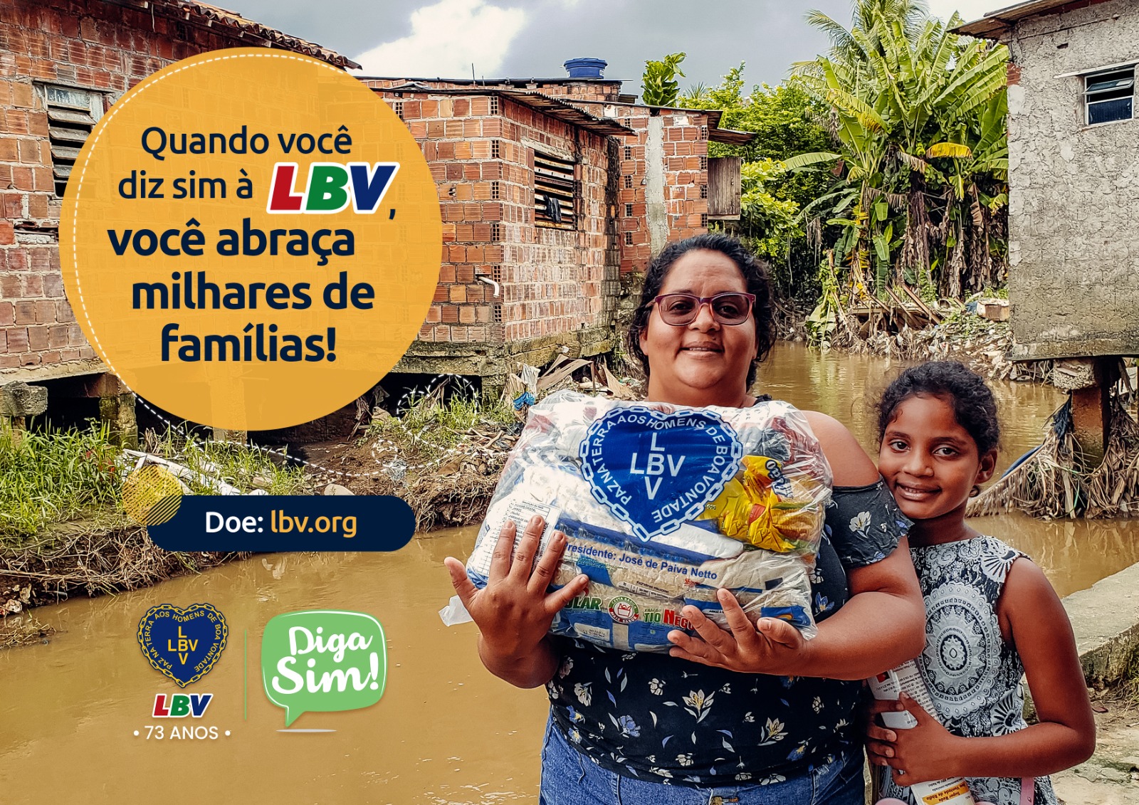 A Campanha Diga SIM! mobiliza a sociedade para fazer doações para as ações emergenciais e humanitárias da Legião da Boa Vontade, que entrega cestas de alimentos não perecíveis a famílias em várias localidades do país.