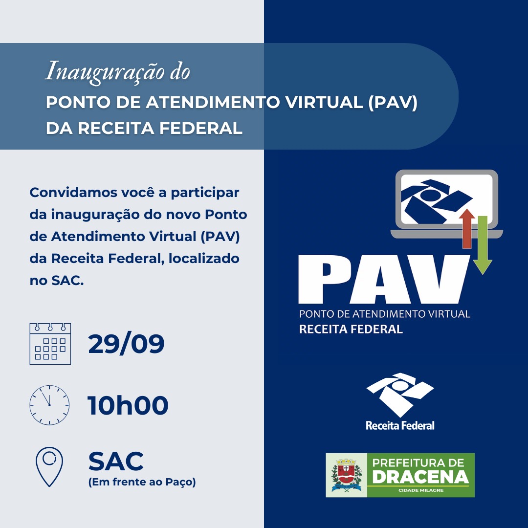 Na sexta-feira, 29/09, às 10h, será inaugurado em Dracena o PAV – Ponto de Atendimento Virtual, um acordo de cooperação técnica entre a Prefeitura e a Receita Federal que objetiva simplificar as relações dos munícipes com a Receita Federal.
