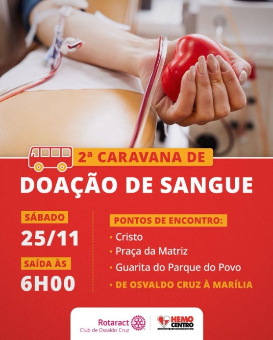 O Rotaract Club de Osvaldo Cruz prepara a 2ª edição da Caravana de Doação de Sangue para levar os doadores de Osvaldo Cruz e região para o Hemocentro de Marilia neste mês de novembro.