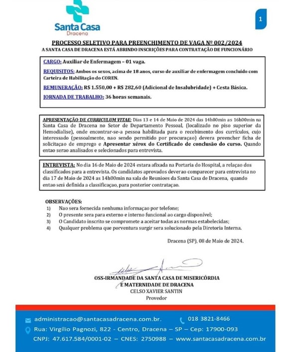 SANTA CASA DE DRACENA ABRE PROCESSO SELETIVO PARA CONTRATAÇÃO DE AUXILIAR DE ENFERMAGEM