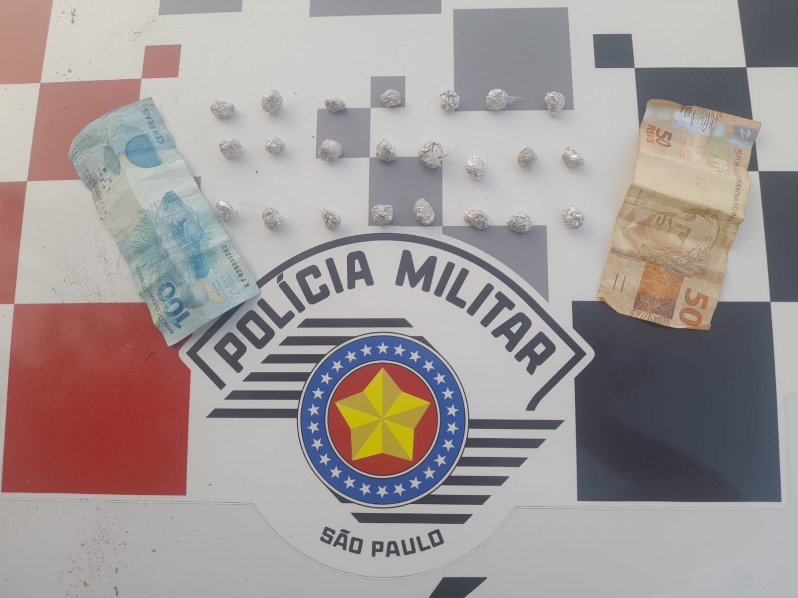 Diante do que foi exposto com apoio das equipes policiais militares e com autorização da indiciada foi realizada diligências em sua residência, foi localizado 23 invólucros envoltos em papel alumínio, espalhados entre blocos e pelo chão do quintal, também foram realizadas diligências em outros locais onde ele havia passado, porém nada mais foi encontrado.