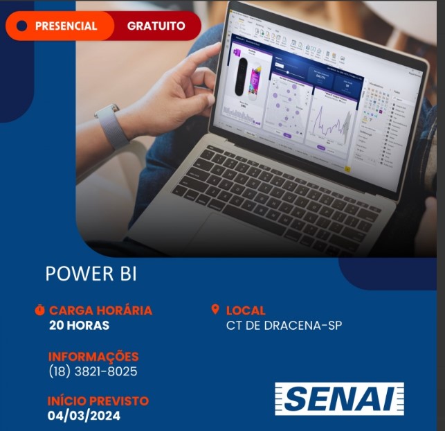 O Senai de Dracena está com inscrições abertas para o curso gratuito de Aperfeiçoamento Profissional Power BI, com início das aulas previsto para o dia 04 de março. São 16 vagas disponíveis.