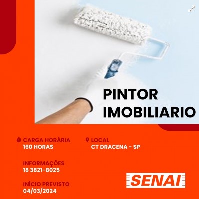 O SENAI de Dracena está com inscrições abertas para o curso de formação profissional de Pintor Imobiliário. São 16 vagas disponíveis para o curso gratuito, com início previsto para o dia 04 de março.