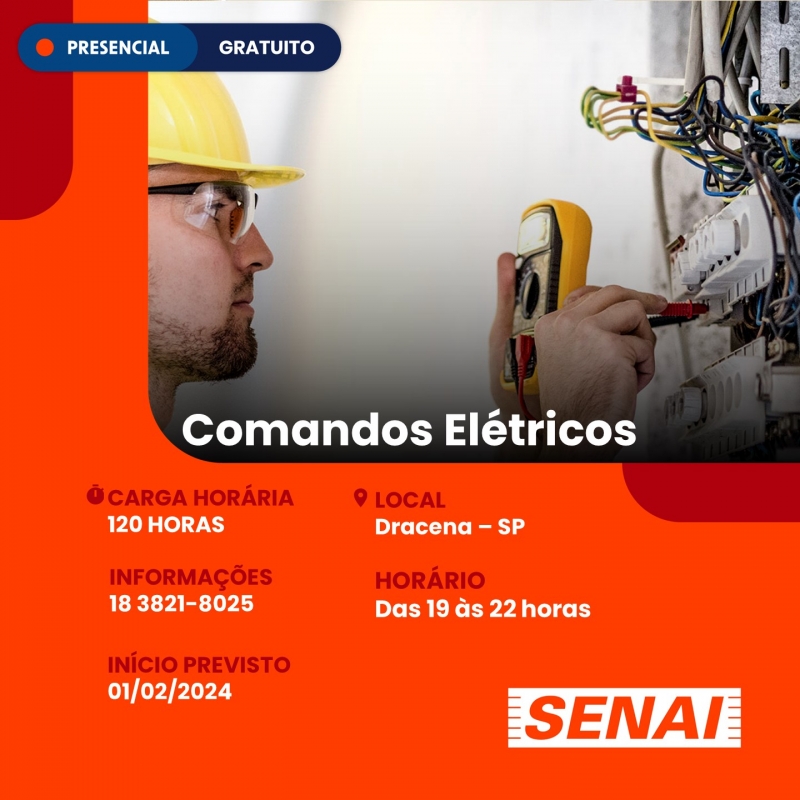 O Centro de Treinamentos de Senai de Dracena está com inscrições abertas pra o curso de Comandos Elétricos, com carga horária de 120 horas. O curso tem previsão de iniciar no dia 01/02 e será realizado no período noturno, das 19h às 22h.
