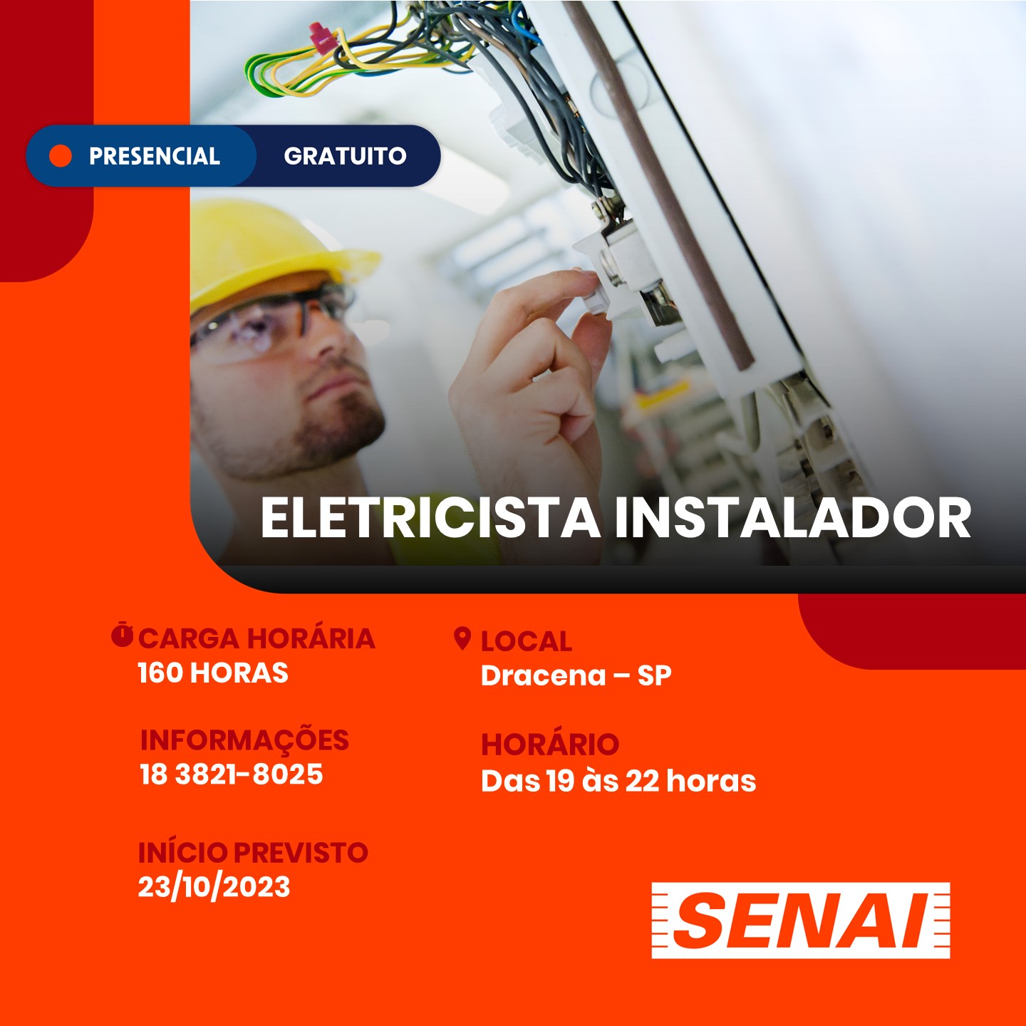 O SENAI Dracena está com inscrições abertas para o curso presencial gratuito de Eletricista Instalador. A carga horária é de 160 horas e o início das aulas está previsto para o dia 23/10 (segunda-feira).