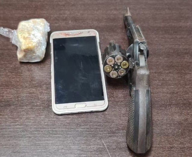 Posteriormente, os militares identificaram o suspeito estava armado com um revólver calibre 38, carregado com seis cartuchos, sendo um deflagrado, um “picotado” e quatro intactos. Também foi encontrado um celular e uma pedra bruta de crack nos pertences do suspeito.